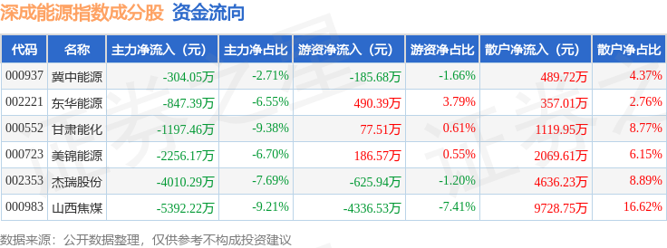 资金流向方面,深成能源(399680)指数成份股当日主力资金净流出合计1.4亿元,游资资金净流出合计4393.68万元,散户资金净流入合计1.84亿元。成份股资金流向详情见下表: