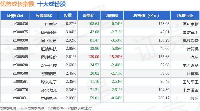 证券之星消息,9月23日,优势成长(399698)指数报收于51943.38点,跌0.95%,成交111.07亿元,换手率2.5%。当日该指数成份股中,上涨的有8家,恒帅股份以15.26%的涨幅领涨,下跌的有42家,汇纳科技以5.06%的跌幅领跌。
