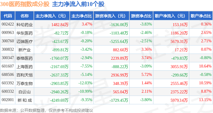 资金流向方面,300医药(399913)指数成份股当日主力资金净流出合计25.73亿元,游资资金净流入合计3.74亿元,散户资金净流入合计21.98亿元。成份股资金流向详情见下表: