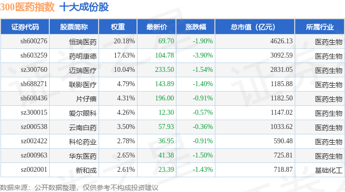 证券之星消息,9月23日,300医药(399913)指数报收于9388.94点,跌1.95%,成交262.57亿元,换手率1.06%。当日该指数成份股中,下跌的有25家,药明康德以3.9%的跌幅领跌。