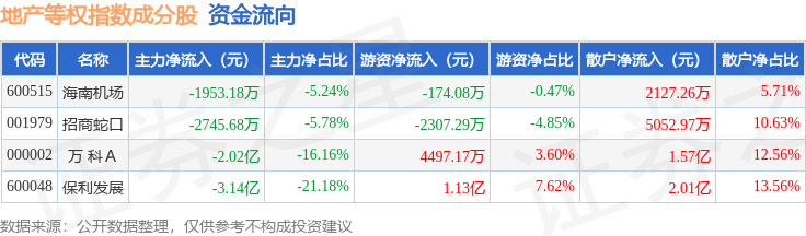 资金流向方面,地产等权(399983)指数成份股当日主力资金净流出合计5.63亿元,游资资金净流入合计1.33亿元,散户资金净流入合计4.3亿元。成份股资金流向详情见下表: