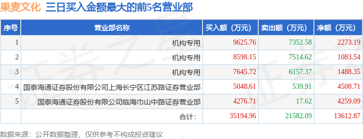 证券之星消息,沪深交易所2025年9月23日公布的交易公开信息显示,果麦文化(301052)因连续三个交易日内,涨幅偏离值累计达到30%的证券登上龙虎榜。此次是近5个交易日内第1次上榜。