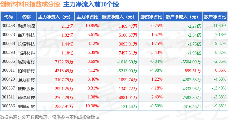 资金流向方面,创新材料R(470039)指数成份股当日主力资金净流出合计16.99亿元,游资资金净流入合计11.65亿元,散户资金净流入合计5.34亿元。成份股资金流向详情见下表: