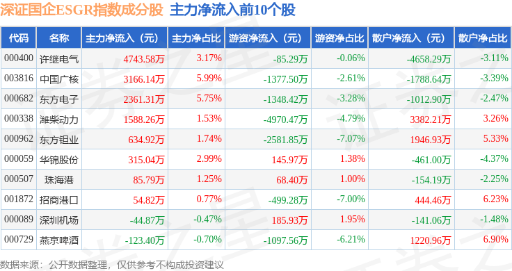 资金流向方面,深证国企ESGR(470055)指数成份股当日主力资金净流出合计30.16亿元,游资资金净流入合计5.07亿元,散户资金净流入合计25.1亿元。成份股资金流向详情见下表: