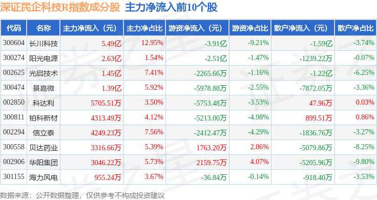 资金流向方面,深证民企科技R(470059)指数成份股当日主力资金净流出合计71.28亿元,游资资金净流入合计19.25亿元,散户资金净流入合计52.03亿元。成份股资金流向详情见下表: