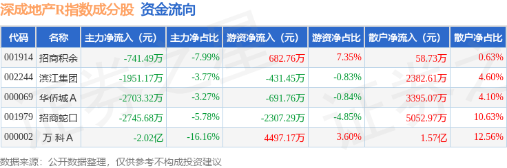 资金流向方面,深成地产R(471001)指数成份股当日主力资金净流出合计2.84亿元,游资资金净流入合计1749.44万元,散户资金净流入合计2.66亿元。成份股资金流向详情见下表:
