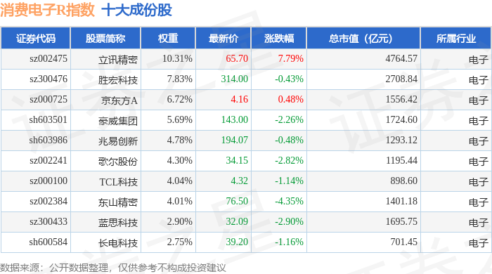 证券之星消息,9月23日,消费电子R(480030)指数报收于9004.25点,涨0.42%,成交1802.0亿元,换手率3.82%。当日该指数成份股中,上涨的有19家,和而泰以10.01%的涨幅领涨,下跌的有31家,东山精密以4.35%的跌幅领跌。