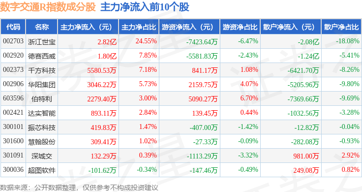资金流向方面,数字交通R(480075)指数成份股当日主力资金净流出合计26.31亿元,游资资金净流入合计8.4亿元,散户资金净流入合计17.92亿元。成份股资金流向详情见下表: