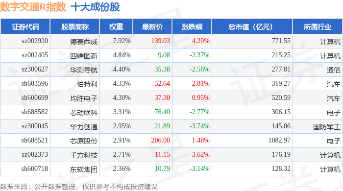 证券之星消息,9月23日,数字交通R(480075)指数报收于3606.58点,跌0.49%,成交465.32亿元,换手率3.09%。当日该指数成份股中,上涨的有11家,恒帅股份以15.26%的涨幅领涨,下跌的有39家,启明信息以5.8%的跌幅领跌。