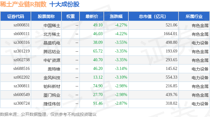 稀土产业链R(489013)指数十大成份股详情如下: