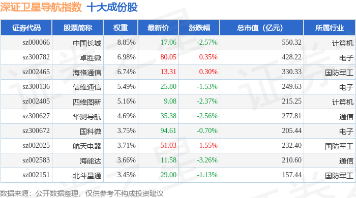 证券之星消息,9月23日,深证卫星导航(970050)指数报收于3236.85点,跌1.77%,成交214.95亿元,换手率4.69%。当日该指数成份股中,上涨的有5家,星网宇达以2.62%的涨幅领涨,下跌的有36家,启明信息以5.8%的跌幅领跌。