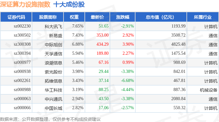 证券之星消息,9月23日,深证算力设施(970051)指数报收于11674.42点,跌0.69%,成交1625.92亿元,换手率6.13%。当日该指数成份股中,上涨的有14家,东华软件以7.41%的涨幅领涨,下跌的有36家,拓维信息以6.68%的跌幅领跌。