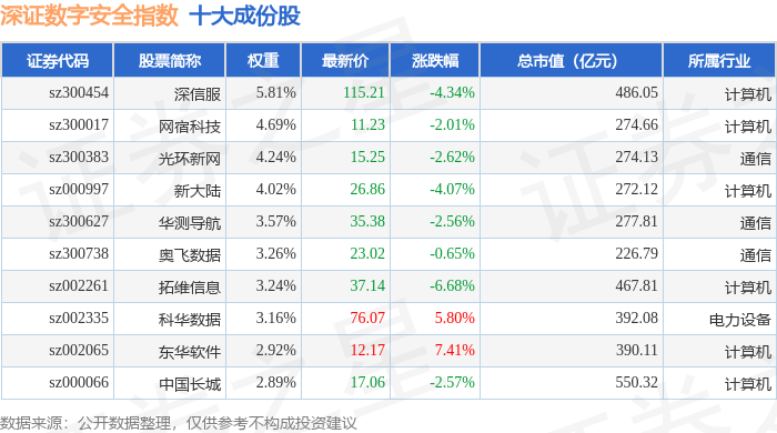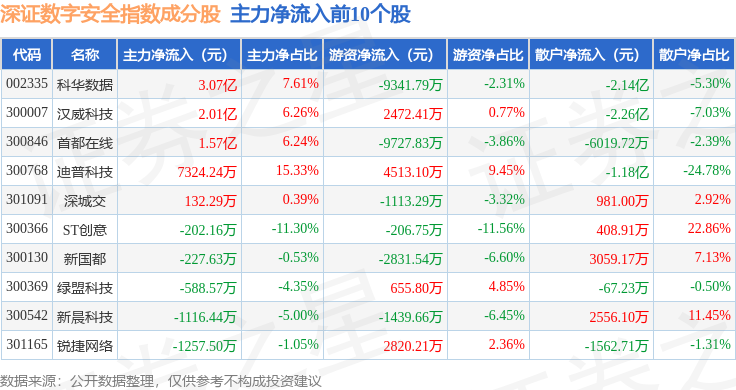 资金流向方面,深证数字安全(970052)指数成份股当日主力资金净流出合计35.55亿元,游资资金净流入合计1.97亿元,散户资金净流入合计33.58亿元。成份股资金流向详情见下表:
