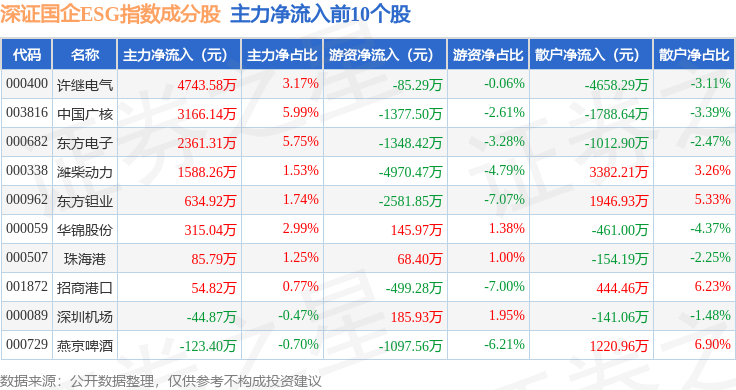 资金流向方面,深证国企ESG(970055)指数成份股当日主力资金净流出合计30.16亿元,游资资金净流入合计5.07亿元,散户资金净流入合计25.1亿元。成份股资金流向详情见下表: