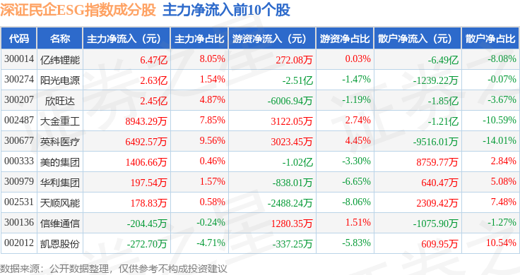 资金流向方面,深证民企ESG(970056)指数成份股当日主力资金净流出合计62.22亿元,游资资金净流入合计16.71亿元,散户资金净流入合计45.51亿元。成份股资金流向详情见下表:
