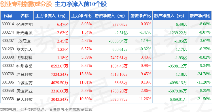资金流向方面,创业专利(970068)指数成份股当日主力资金净流出合计13.85亿元,游资资金净流入合计8.64亿元,散户资金净流入合计5.2亿元。成份股资金流向详情见下表: