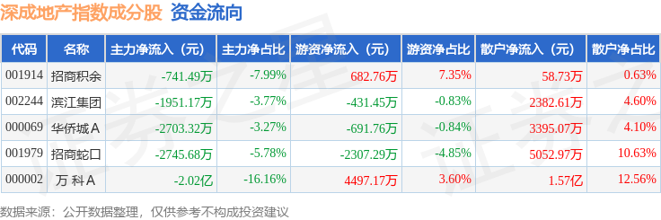 资金流向方面,深成地产(971001)指数成份股当日主力资金净流出合计2.84亿元,游资资金净流入合计1749.44万元,散户资金净流入合计2.66亿元。成份股资金流向详情见下表: