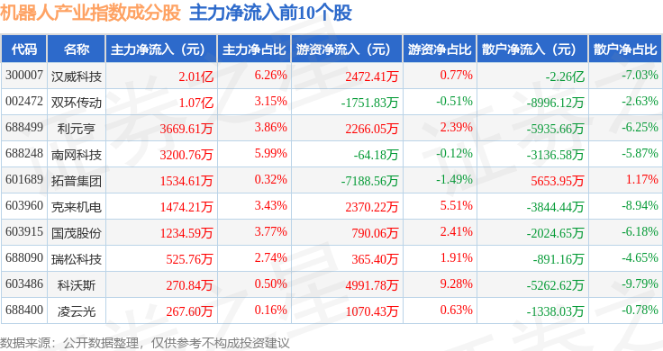 资金流向方面,机器人产业(980022)指数成份股当日主力资金净流出合计22.53亿元,游资资金净流入合计8.12亿元,散户资金净流入合计14.41亿元。成份股资金流向详情见下表: