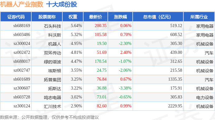 机器人产业(980022)指数十大成份股详情如下: