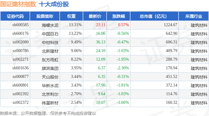 证券之星消息,9月23日,国证建材(980048)指数报收于4739.78点,跌0.98%,成交100.33亿元,换手率1.78%。当日该指数成份股中,上涨的有4家,蒙娜丽莎以4.7%的涨幅领涨,下跌的有26家,公元股份以6.33%的跌幅领跌。