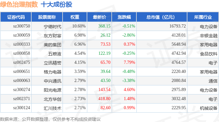 绿色治理(980058)指数十大成份股详情如下: