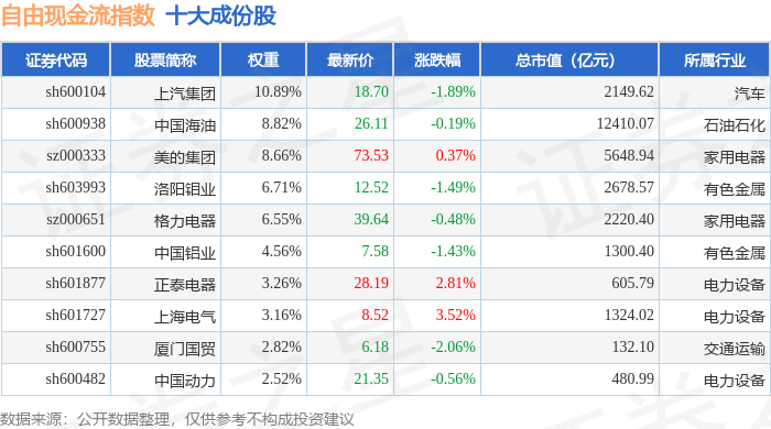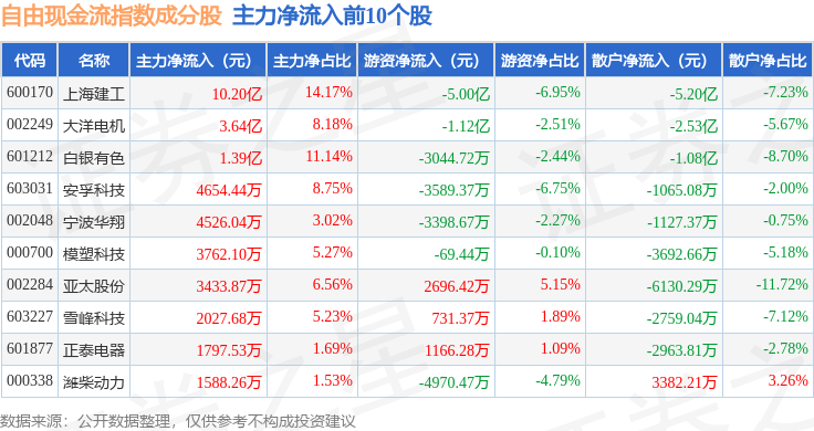 资金流向方面,自由现金流(980092)指数成份股当日主力资金净流出合计3.76亿元,游资资金净流出合计3.88亿元,散户资金净流入合计7.64亿元。成份股资金流向详情见下表: