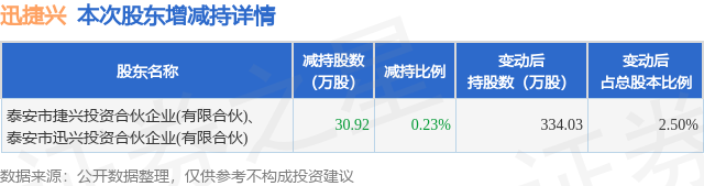 证券之星消息,9月23日迅捷兴发布公告《迅捷兴:股东减持股份结果公告》,其股东泰安市捷兴投资合伙企业(有限合伙)、泰安市迅兴投资合伙企业(有限合伙)于2025年6月27日至2025年9月23日间合计减持30.92万股,占公司目前总股本的0.2318%,变动期间该股股价上涨7.91%,截止9月23日收盘报21.69元。