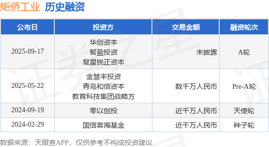证券之星消息,根据天眼查APP于9月17日公布的信息整理,威海矩侨工业科技有限公司A轮融资,融资额未披露,参与投资的机构包括华创资本,智盈投资,复星锐正资本。