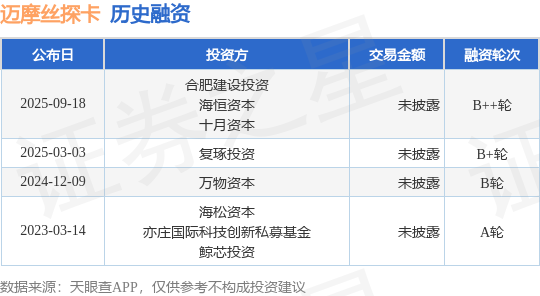证券之星消息,根据天眼查APP于9月18日公布的信息整理,苏州迈摩丝探卡科技有限公司B++轮融资,融资额未披露,参与投资的机构包括合肥建设投资,海恒资本,十月资本。