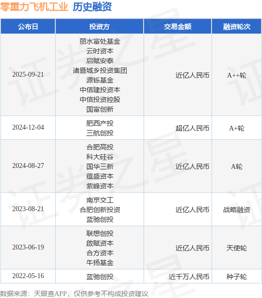 证券之星消息,根据天眼查APP于9月21日公布的信息整理,零重力飞机工业(合肥)有限公司A++轮融资,融资额近亿人民币,参与投资的机构包括丽水富处基金,云时资本,启赋安泰,诸暨城乡投资集团,源铄基金,中信建投资本,中信投资控股,国富创新。