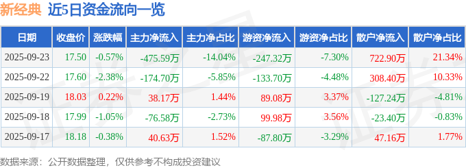 证券之星消息,截至2025年9月23日收盘,新经典(603096)报收于17.5元,下跌0.57%,换手率1.27%,成交量1.96万手,成交额3388.04万元。
