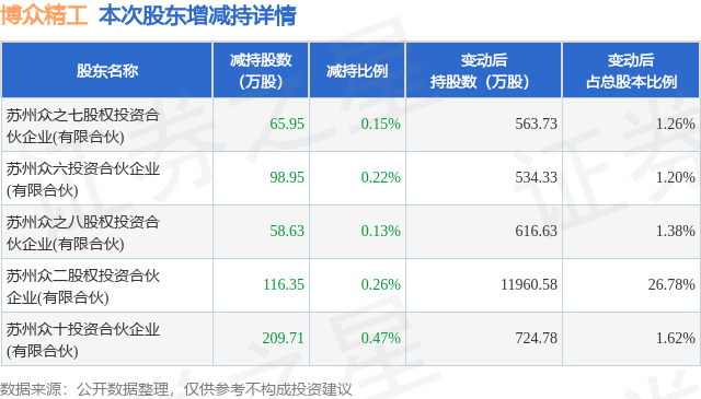 证券之星消息,9月23日博众精工发布公告《博众精工:关于持股5%以上的股东权益变动触及1%刻度的提示性公告》,其股东苏州众之七股权投资合伙企业(有限合伙)、苏州众六投资合伙企业(有限合伙)、苏州众之八股权投资合伙企业(有限合伙)、苏州众二股权投资合伙企业(有限合伙)、苏州众十投资合伙企业(有限合伙)于2025年9月15日至2025年9月22日间合计减持549.59万股,占公司目前总股本的1.2305%,变动期间该股股价上涨5.04%,截止9月22日收盘报38.54元。