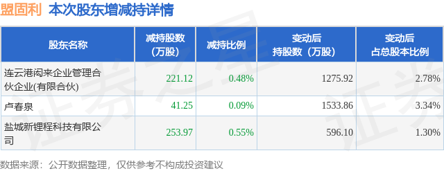 证券之星消息,9月23日盟固利发布公告《盟固利:关于持股5%以上股东减持股份计划期限届满及实施情况暨减持股份触及1%整数倍的公告》,其股东连云港闳来企业管理合伙企业(有限合伙)、卢春泉、盐城新锂程科技有限公司于2025年8月12日至2025年9月22日间合计减持516.34万股,占公司目前总股本的1.1234%,变动期间该股股价上涨25.77%,截止9月22日收盘报28.16元。
