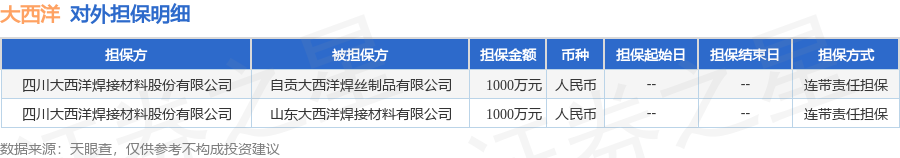 大西洋9月22日披露2笔对外担保,被担保公司2家。对外担保明细如下表: