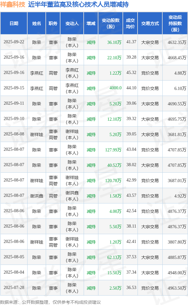 祥鑫科技近半年内的董监高及核心技术人员增减持详情如下:
