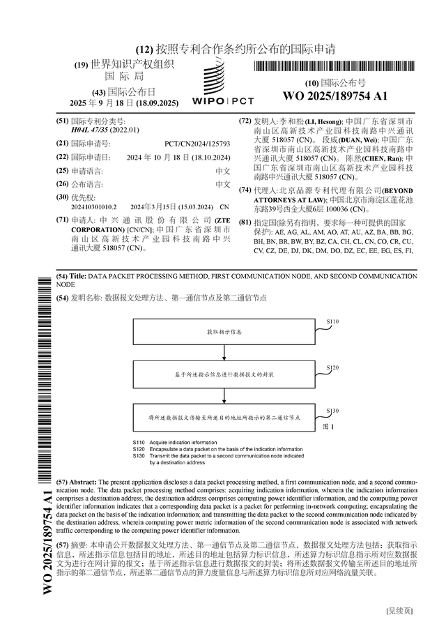 证券之星消息,根据企查查数据显示中兴通讯(000063)公布了一项国际专利申请,专利名为“数据报文处理方法、第一通信节点及第二通信节点”,专利申请号为PCT/CN2024/125793,国际公布日为2025年9月18日。