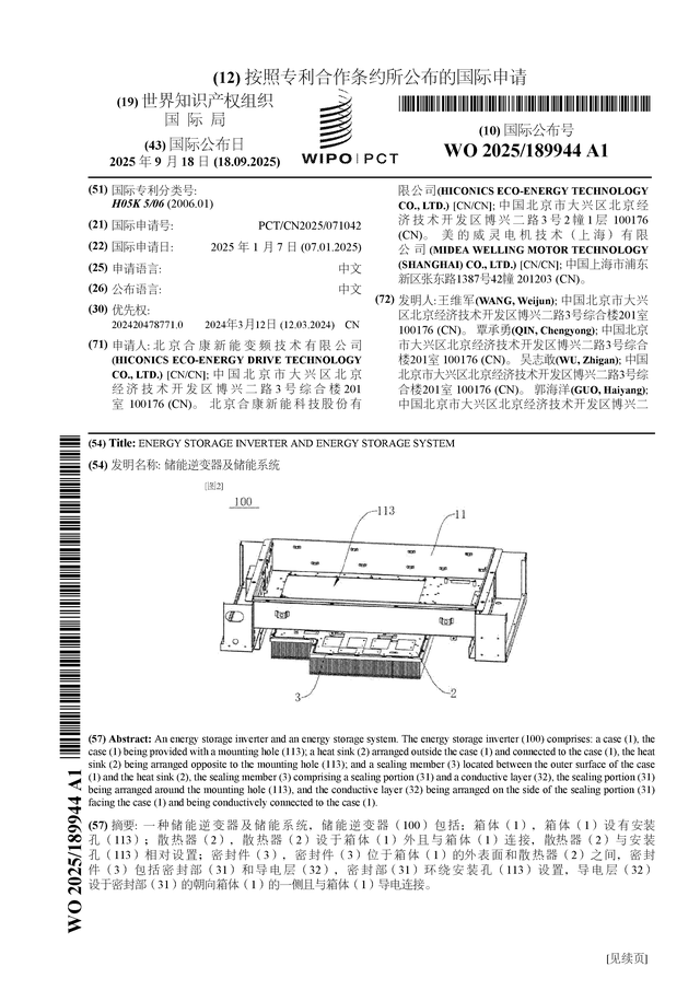 证券之星消息,根据企查查数据显示合康新能(300048)公布了一项国际专利申请,专利名为“储能逆变器及储能系统”,专利申请号为PCT/CN2025/071042,国际公布日为2025年9月18日。