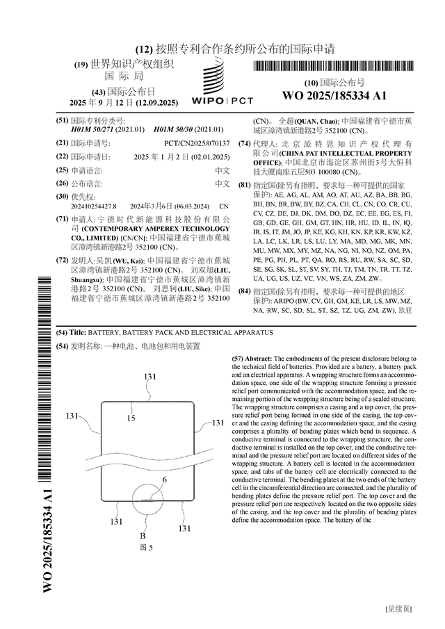 证券之星消息,根据企查查数据显示宁德时代(300750)公布了一项国际专利申请,专利名为“一种电池、电池包和用电装置”,专利申请号为PCT/CN2025/070137,国际公布日为2025年9月11日。