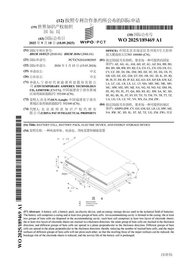 证券之星消息,根据企查查数据显示宁德时代(300750)公布了一项国际专利申请,专利名为“一种电池单体、电池包、用电装置和储能装置”,专利申请号为PCT/CN2024/082005,国际公布日为2025年9月18日。