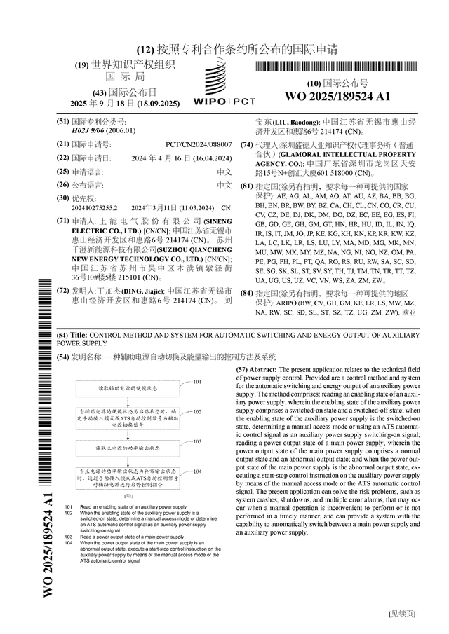 证券之星消息,根据企查查数据显示上能电气(300827)公布了一项国际专利申请,专利名为“一种辅助电源自动切换及能量输出的控制方法及系统”,专利申请号为PCT/CN2024/088007,国际公布日为2025年9月18日。