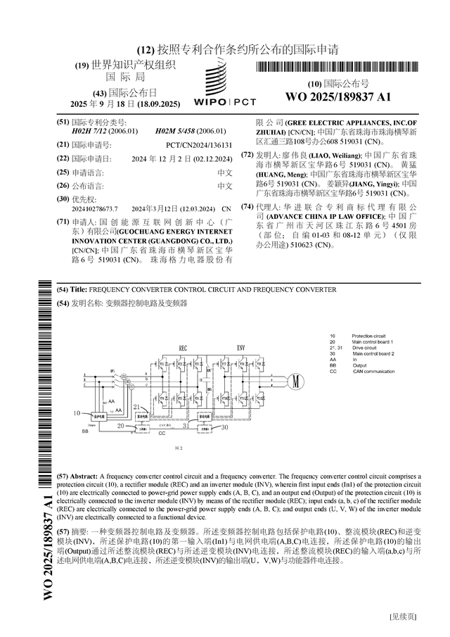 证券之星消息,根据企查查数据显示格力电器(000651)公布了一项国际专利申请,专利名为“变频器控制电路及变频器”,专利申请号为PCT/CN2024/136131,国际公布日为2025年9月18日。