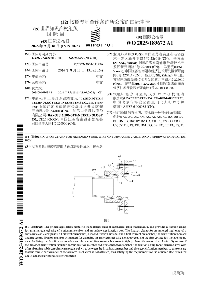 证券之星消息,根据企查查数据显示中天科技(600522)公布了一项国际专利申请,专利名为“海缆铠装钢丝的固定夹具及水下接头盒”,专利申请号为PCT/CN2024/111896,国际公布日为2025年9月18日。