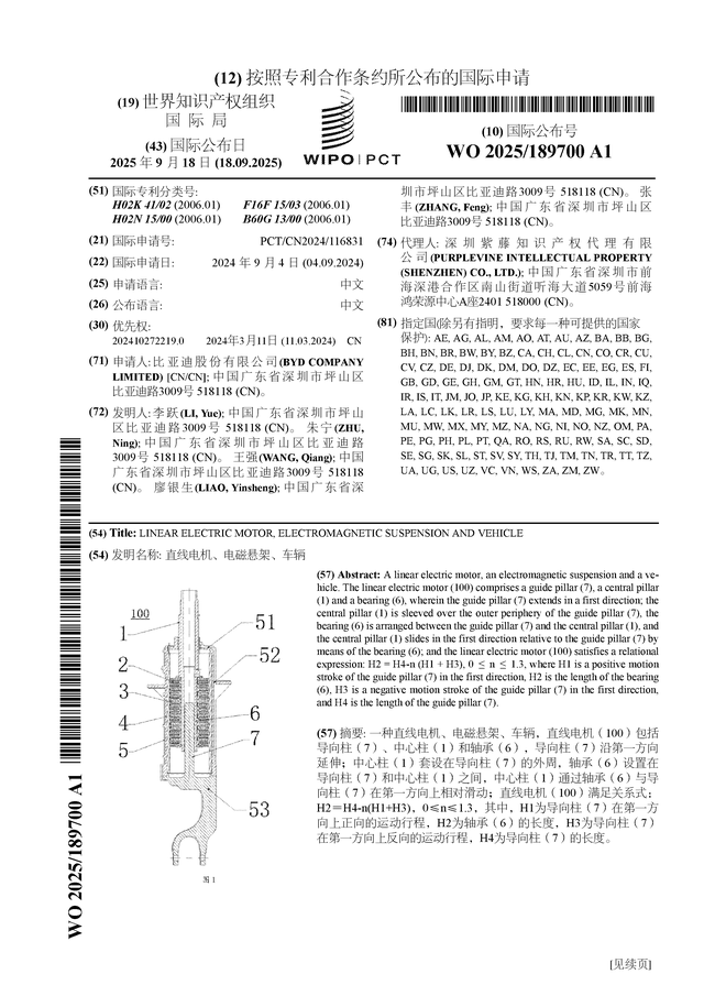 证券之星消息,根据企查查数据显示比亚迪(002594)公布了一项国际专利申请,专利名为“直线电机、电磁悬架、车辆”,专利申请号为PCT/CN2024/116831,国际公布日为2025年9月18日。