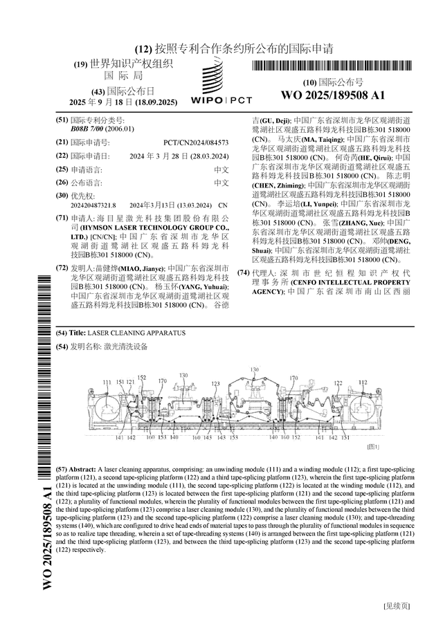 证券之星消息,根据企查查数据显示海目星(688559)公布了一项国际专利申请,专利名为“激光清洗设备”,专利申请号为PCT/CN2024/084573,国际公布日为2025年9月18日。