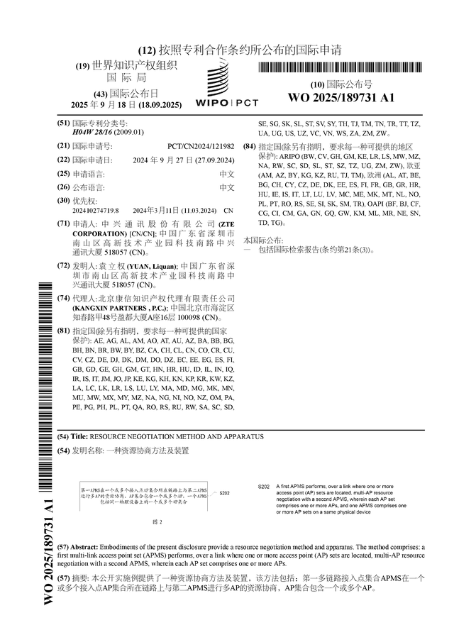 证券之星消息,根据企查查数据显示中兴通讯(000063)公布了一项国际专利申请,专利名为“一种资源协商方法及装置”,专利申请号为PCT/CN2024/121982,国际公布日为2025年9月18日。