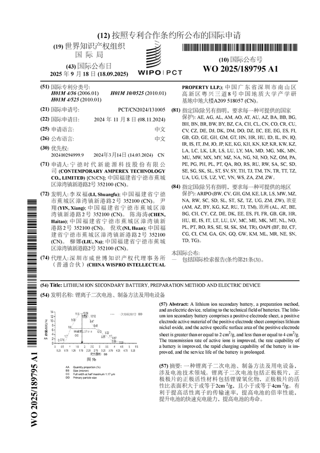 证券之星消息,根据企查查数据显示宁德时代(300750)公布了一项国际专利申请,专利名为“锂离子二次电池、制备方法及用电设备”,专利申请号为PCT/CN2024/131005,国际公布日为2025年9月18日。