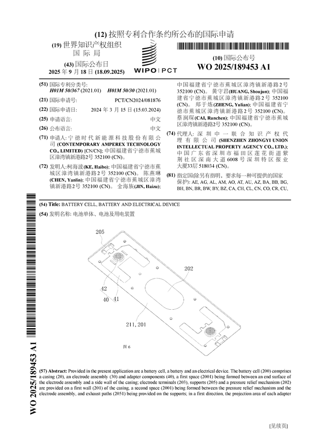 证券之星消息,根据企查查数据显示宁德时代(300750)公布了一项国际专利申请,专利名为“电池单体、电池及用电装置”,专利申请号为PCT/CN2024/081876,国际公布日为2025年9月18日。