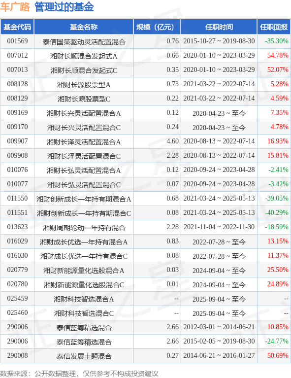 车广路先生:中国国籍,副总经理兼投资总监,工商管理学硕士。曾任泰信基金管理有限公司研究员、高级研究员、基金经理。先后担任泰信蓝筹精选股票型证券投资基金基金经理、泰信发展主题股票型证券投资基金基金经理、泰信国策驱动灵活配置混合型证券投资基金基金经理、湘财长源股票型证券投资基金基金经理、湘财长泽灵活配置混合型证券投资基金基金经理、湘财周期轮动一年持有期混合型证券投资基金基金经理、湘财长顺混合型发起式证券投资基金基金经理、湘财长弘灵活配置混合型证券投资基金基金经理、湘财创新成长一年持有期混合型证券投资基金基金经理。现任湘财基金管理有限公司副总经理、投资总监、湘财长兴灵活配置混合型证券投资基金基金经理、湘财成长优选一年持有期混合型证券投资基金基金经理、湘财新能源量化选股混合型证券投资基金基金经理。