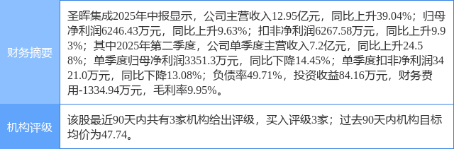 2025年8月8日,天风证券研究员鲍荣富,王涛,王雯,王悦宜发布了对圣晖集成的研报《订单&营收均实现高增,海外收入同比增长191%》,该研报对圣晖集成给出“买入”评级。研报中预计公司25-27年归母净利润为1.34、1.55、1.75亿(yoy+17%、+15%、+13%),对应PE为26、23、20倍,维持“买入”评级。证券之星数据中心根据近三年发布的研报数据计算,该研报作者对此股的盈利预测准确度为48.24%。