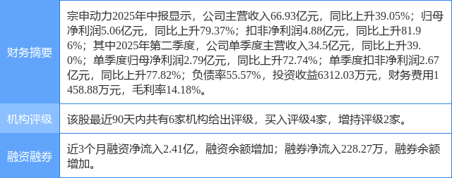 2025年8月27日,西南证券研究员邰桂龙发布了对宗申动力的研报《2025年半年报点评:聚焦主业布局新兴领域,上半年业绩实现高速增长》,该研报对宗申动力给出“买入”评级。研报中预计公司2025-2027年归母净利润分别为8.9、10.9、12.9亿元,对应当前股价PE分别为34、27、23倍,未来三年归母净利润复合增速为41%。公司聚焦核心主业,同时积极布局新兴领域,产业转型升级稳步推进,维持“买入”评级。证券之星数据中心根据近三年发布的研报数据计算,该研报作者对此股的盈利预测准确度为50.26%。